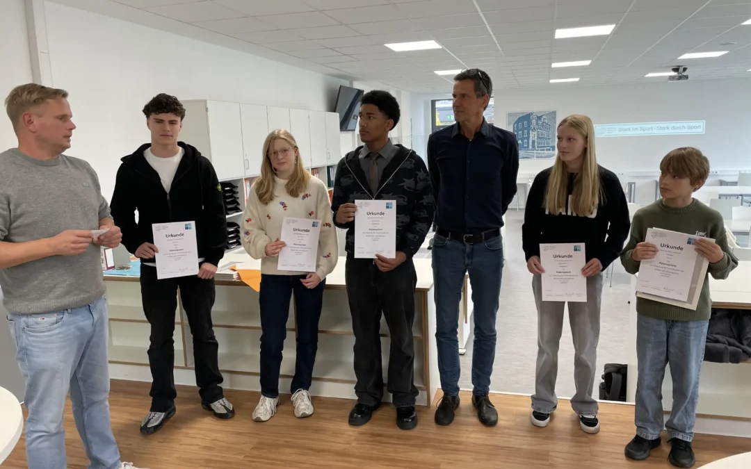Am Freitag, den 31. Oktober 2025, durften wir fünf neue Schülerinnen und Schüler feierlich in unser "Patensystem zur Förderung der Vereinbarkeit von Schule und Leistungssport" aufnehmen. Semih Kücük (6b - Fußball), Emanuel Buch (10a - Boxsport), Benjamin Obiwuru (EF - Basketball), Josephine Tenhoff (EF - Fußball) und Vivien Trinschek (Q2…