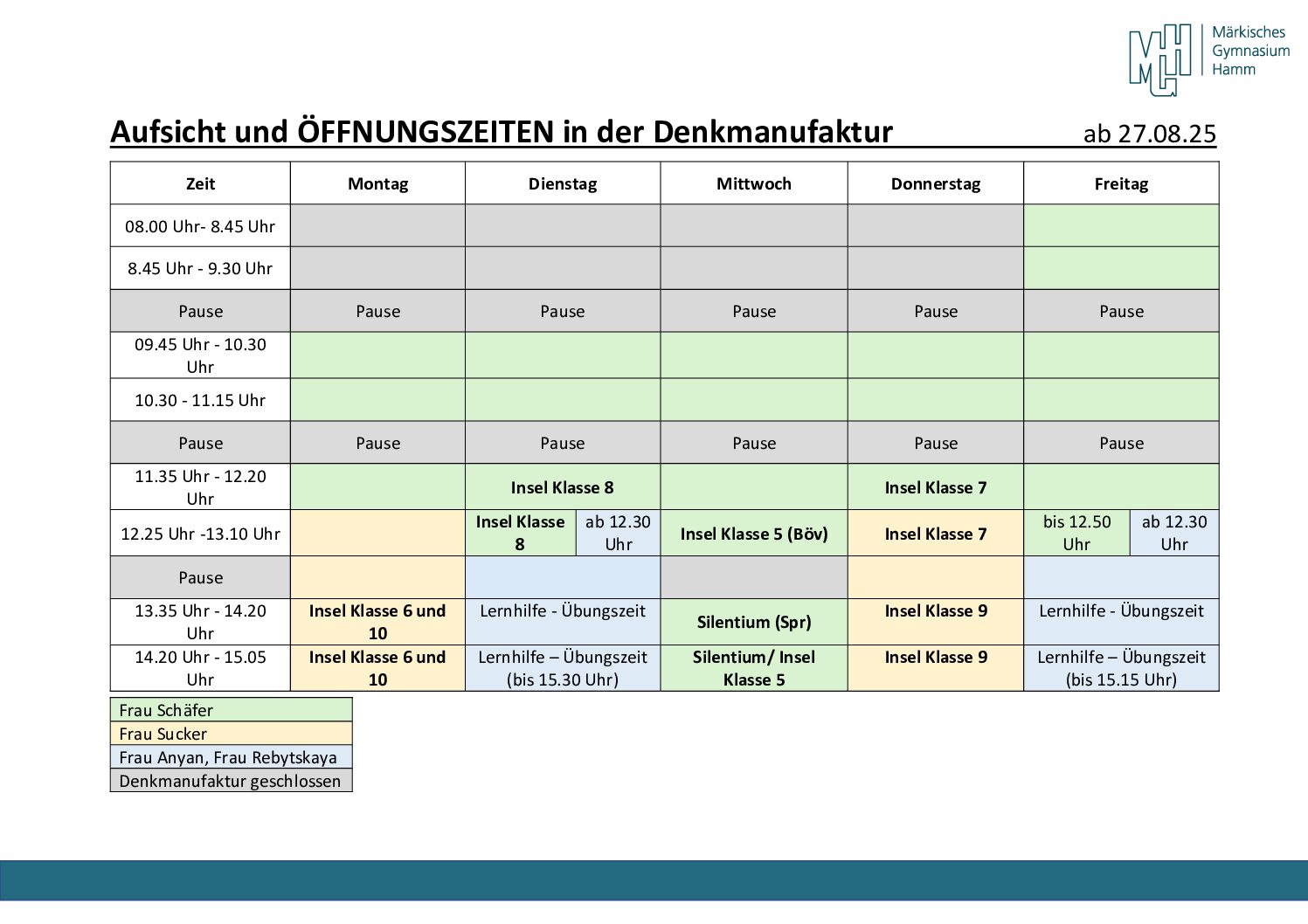 Seit Schuljahresbeginn 2022/23 ist außerdem die Lernhilfe in die Denkmanufaktur integriert, so dass bei zusätzlich benötigtem Unterstützungsbedarf auch hier täglich Ansprechpartner vor Ort sind. Ebenso ist die schuleigene Bibliothek ab sofort mit der Denkmanufaktur vernetzt, so dass beide Räumlichkeiten täglich spätestens ab 9.30 Uhr durchgehend (Denkmanufaktur) bzw. in den Pausen und einzelnen Stunden (Bibliothek) geöffnet sind.