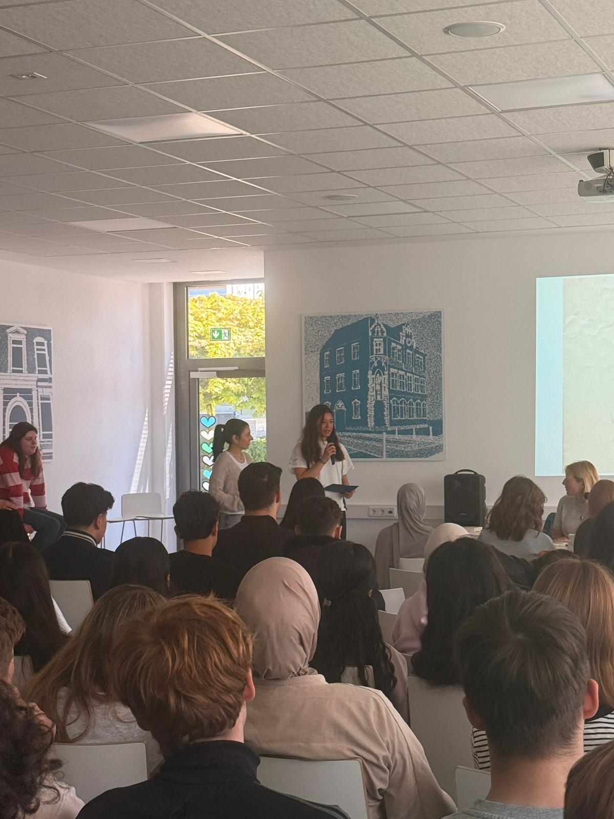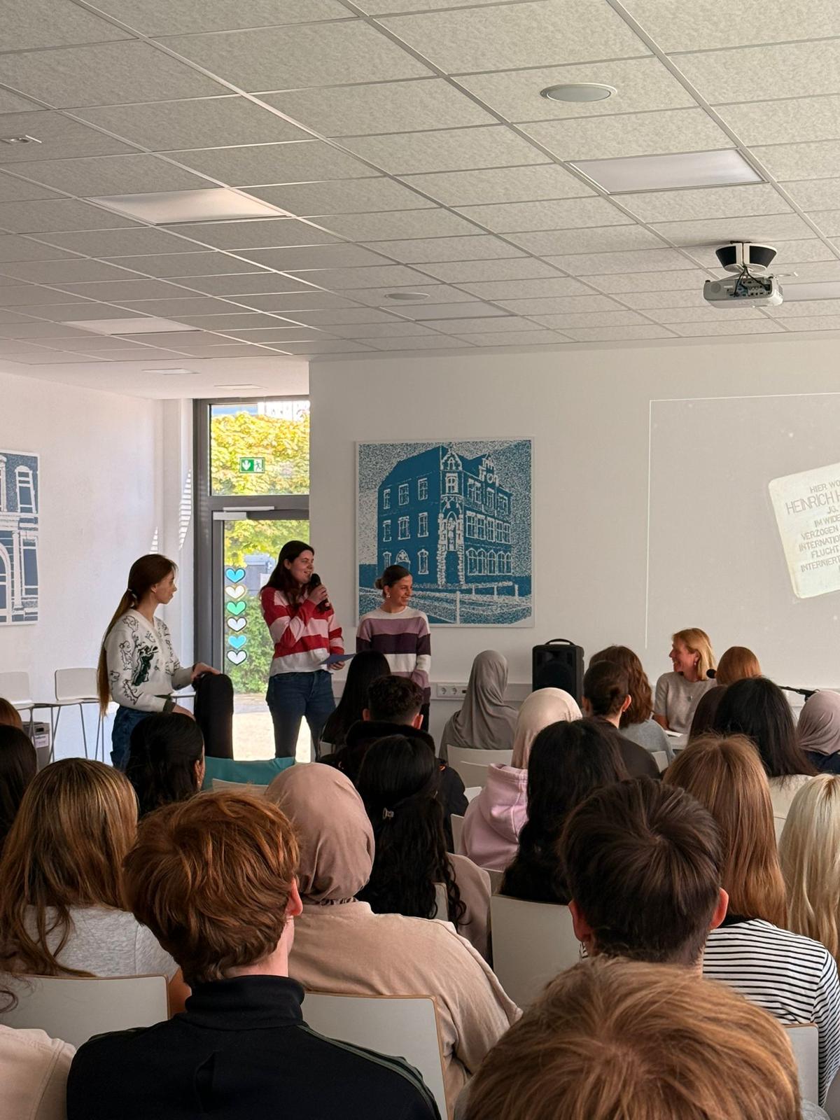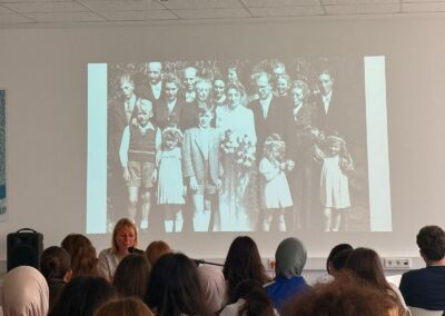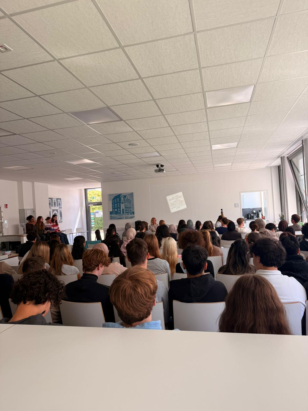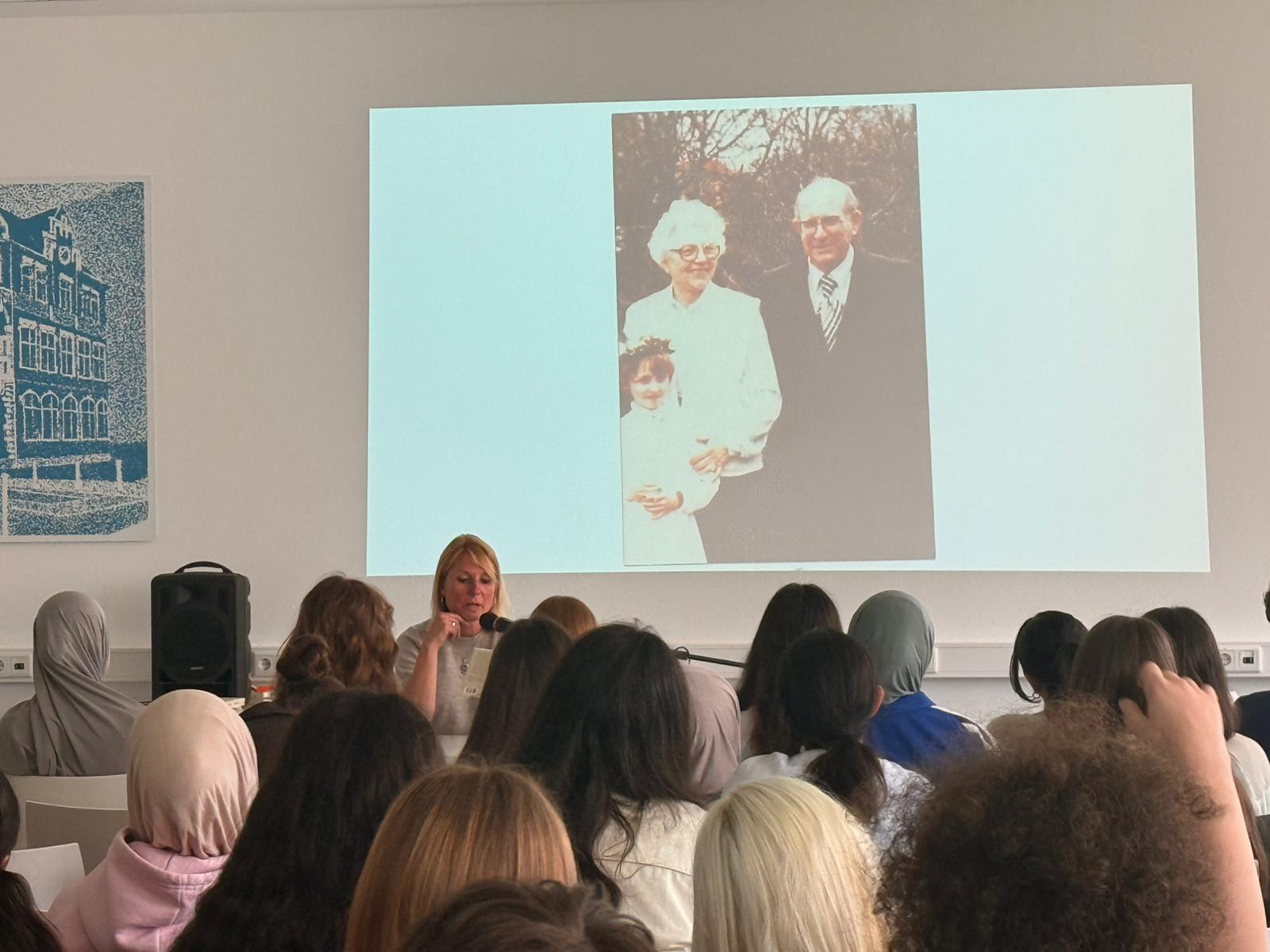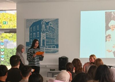 Die Lesung folgte einem abwechslungsreichen Konzept: Auszüge aus dem Roman wechselten sich mit Interview-Blöcken ab, in denen die Autorin offen über ihre Arbeit, ihre familiären Wurzeln und die Entstehungsgeschichte des Buches sprach. In den Gesprächsrunden erzählte Heimann eindrucksvoll von ihren Großeltern, deren Lebenswege sie zu diesem Roman inspirierten. Besonders bewegend war der Moment, als sie Bilder ihrer Familie zeigte und Originalbriefe vorlas, die sich ihre Großeltern während des Zweiten Weltkriegs geschrieben hatten. Die sehr persönlichen Einblicke berührten die Zuhörenden spürbar und machten deutlich, wie eng historische Ereignisse und individuelle Schicksale miteinander verwoben sind. Heimann betonte zudem ihre Motivation für das Schreiben: Rechte Kräfte dürften keine Macht erlangen! Literatur könne – und müsse – dazu beitragen, Zivilcourage zu stärken und gesellschaftliche Verantwortung bewusst zu machen. Die Schülerinnen und Schüler der 10. Klassen folgten aufmerksam den Lesepassagen, die einen Einblick in die bewegende Liebesbeziehung zwischen den Figuren und die politischen Spannungen ihrer Zeit gaben. Die Interviewfragen des Projektkurses waren präzise vorbereitet und führten zu lebendigen, teils sehr persönlichen Antworten der Autorin. Die Mitglieder stellten auch Fragen zur Recherchearbeit, zu Schreibprozessen oder zu den Parallelen zwischen Vergangenheit und Gegenwart. Die Offenheit der Autorin und ihr engagiertes Plädoyer für demokratische Werte hinterließen einen bleibenden Eindruck.