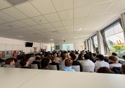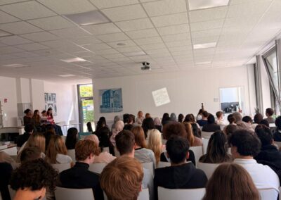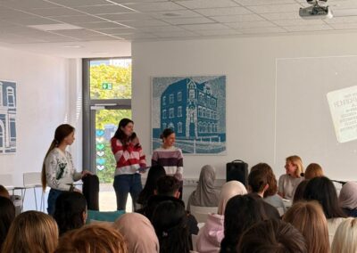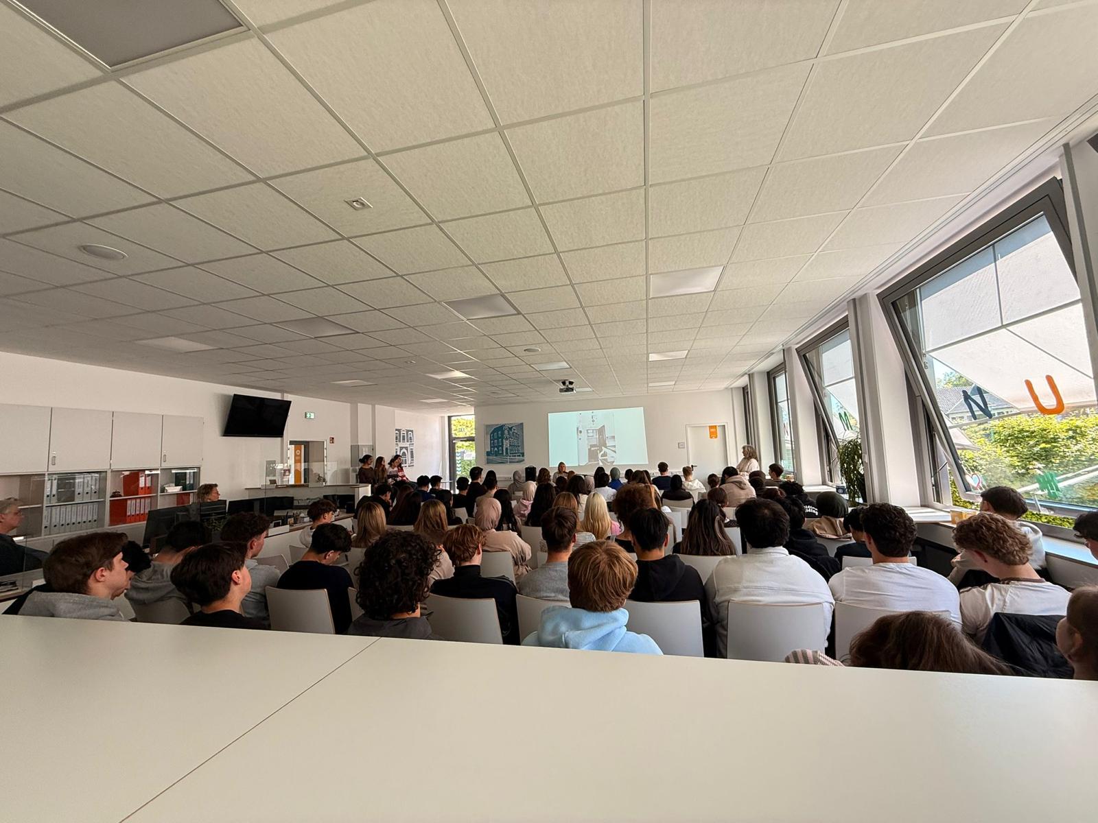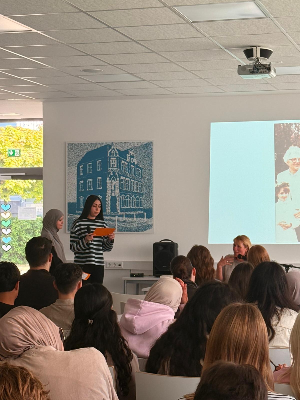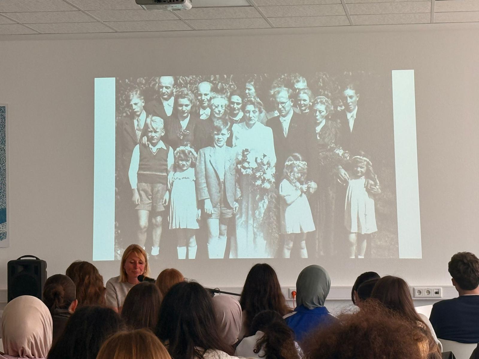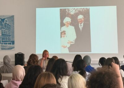 Die Lesung folgte einem abwechslungsreichen Konzept: Auszüge aus dem Roman wechselten sich mit Interview-Blöcken ab, in denen die Autorin offen über ihre Arbeit, ihre familiären Wurzeln und die Entstehungsgeschichte des Buches sprach. In den Gesprächsrunden erzählte Heimann eindrucksvoll von ihren Großeltern, deren Lebenswege sie zu diesem Roman inspirierten. Besonders bewegend war der Moment, als sie Bilder ihrer Familie zeigte und Originalbriefe vorlas, die sich ihre Großeltern während des Zweiten Weltkriegs geschrieben hatten. Die sehr persönlichen Einblicke berührten die Zuhörenden spürbar und machten deutlich, wie eng historische Ereignisse und individuelle Schicksale miteinander verwoben sind. Heimann betonte zudem ihre Motivation für das Schreiben: Rechte Kräfte dürften keine Macht erlangen! Literatur könne – und müsse – dazu beitragen, Zivilcourage zu stärken und gesellschaftliche Verantwortung bewusst zu machen. Die Schülerinnen und Schüler der 10. Klassen folgten aufmerksam den Lesepassagen, die einen Einblick in die bewegende Liebesbeziehung zwischen den Figuren und die politischen Spannungen ihrer Zeit gaben. Die Interviewfragen des Projektkurses waren präzise vorbereitet und führten zu lebendigen, teils sehr persönlichen Antworten der Autorin. Die Mitglieder stellten auch Fragen zur Recherchearbeit, zu Schreibprozessen oder zu den Parallelen zwischen Vergangenheit und Gegenwart. Die Offenheit der Autorin und ihr engagiertes Plädoyer für demokratische Werte hinterließen einen bleibenden Eindruck.